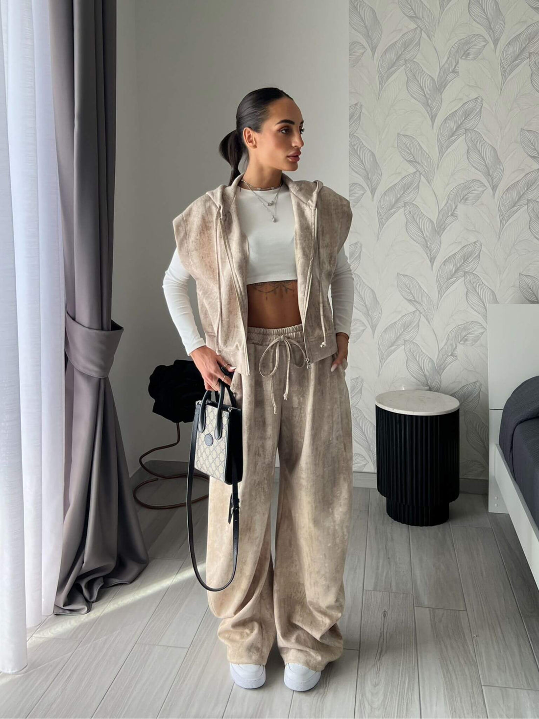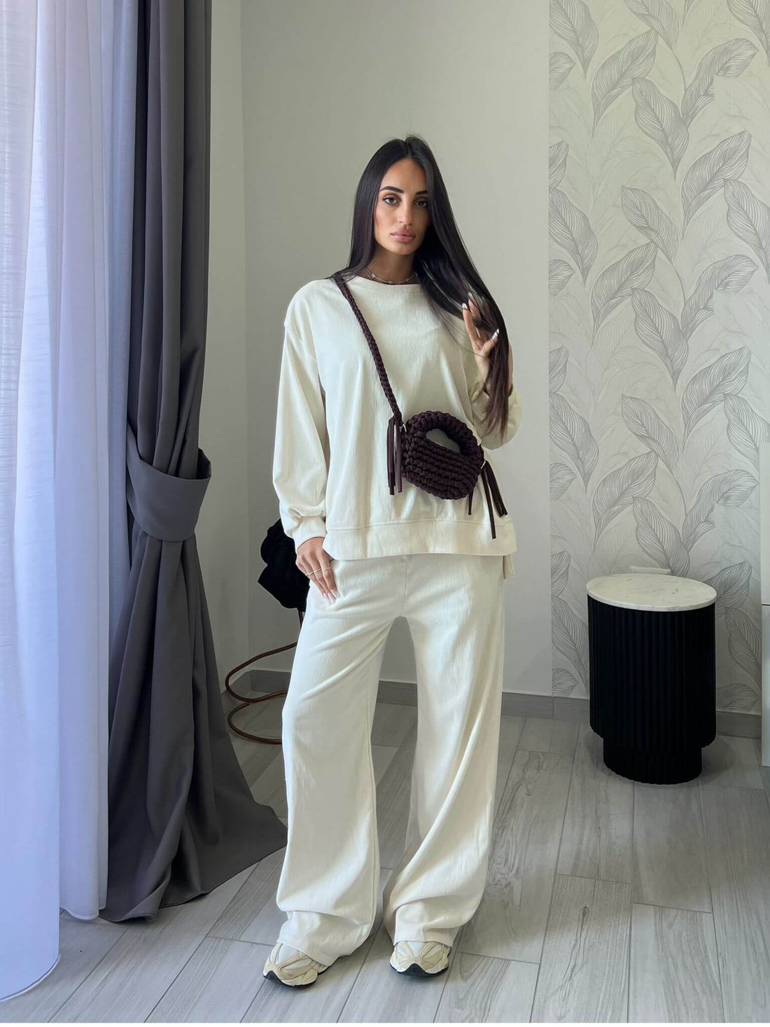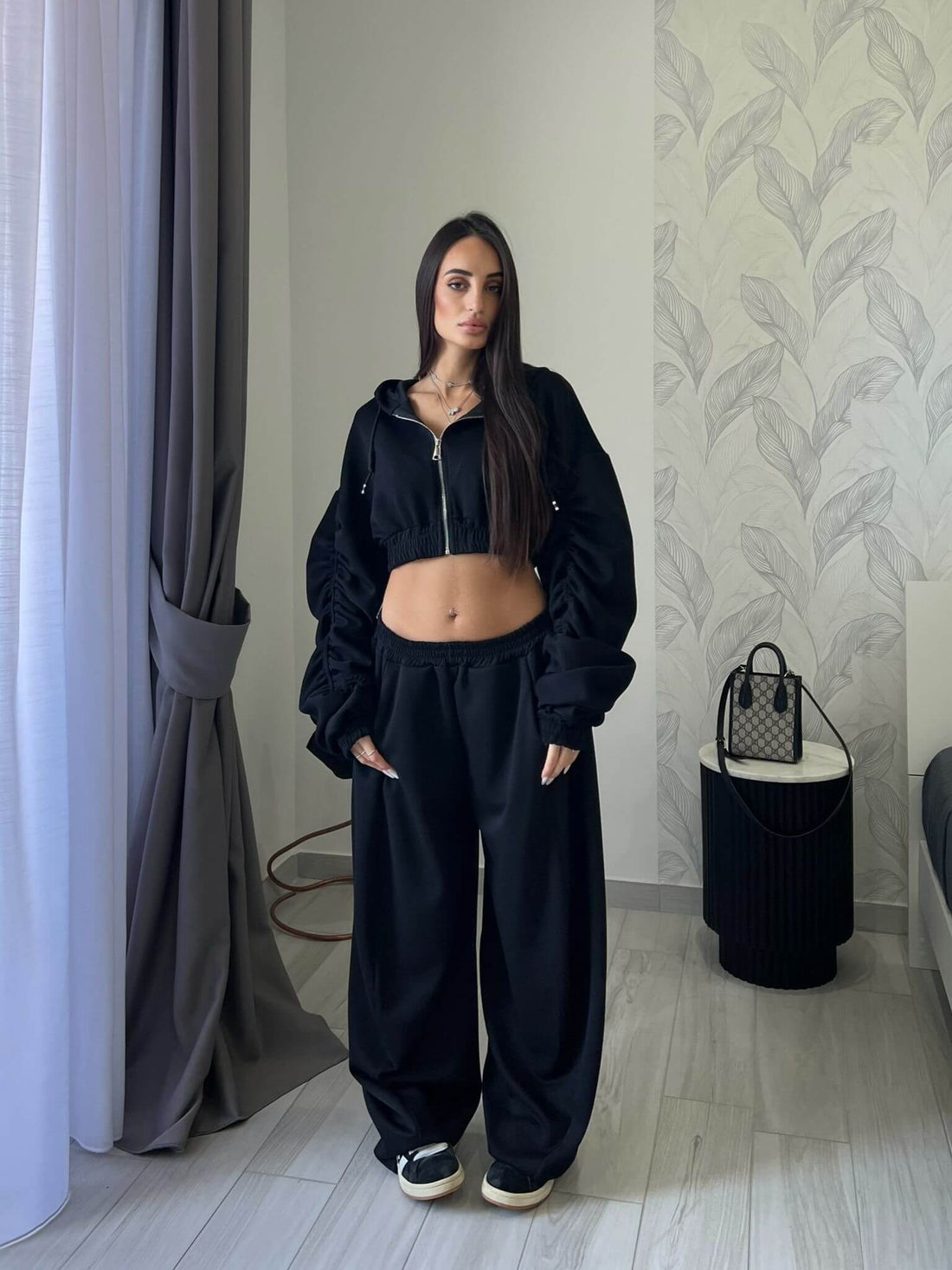 Coordinato tuta due pezzi, con pantalone elasticizzato e felpa crop con maniche particolari.