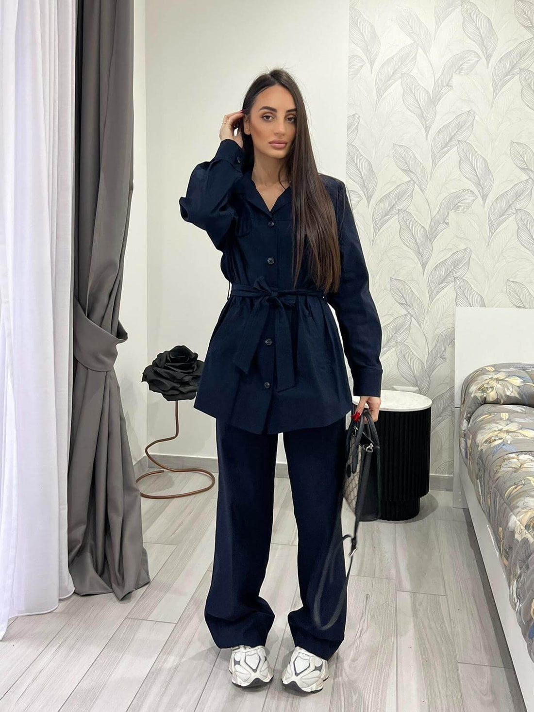 Tailleur composto da bermuda e giacca con spalline e porta una cintura in vita.