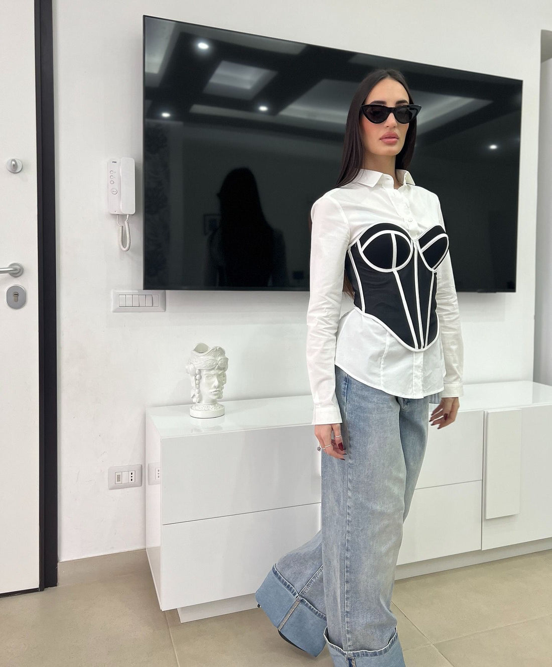 Coordinato, pantalone elasticizzato e camicia a portafoglio.