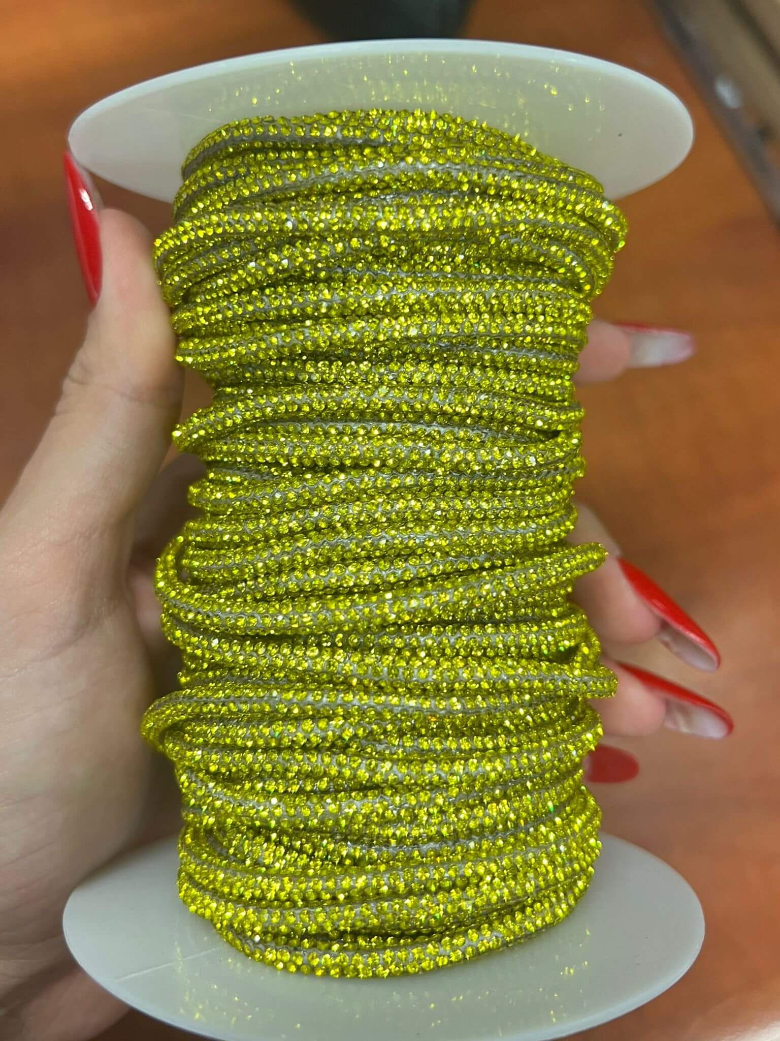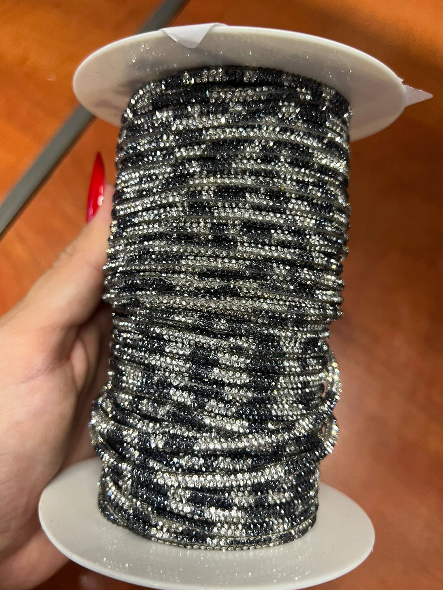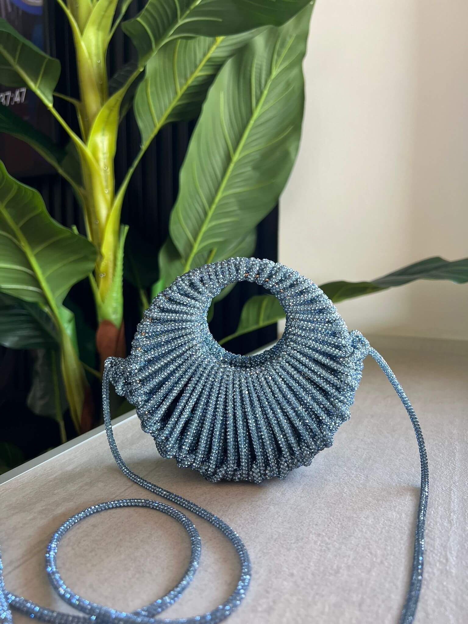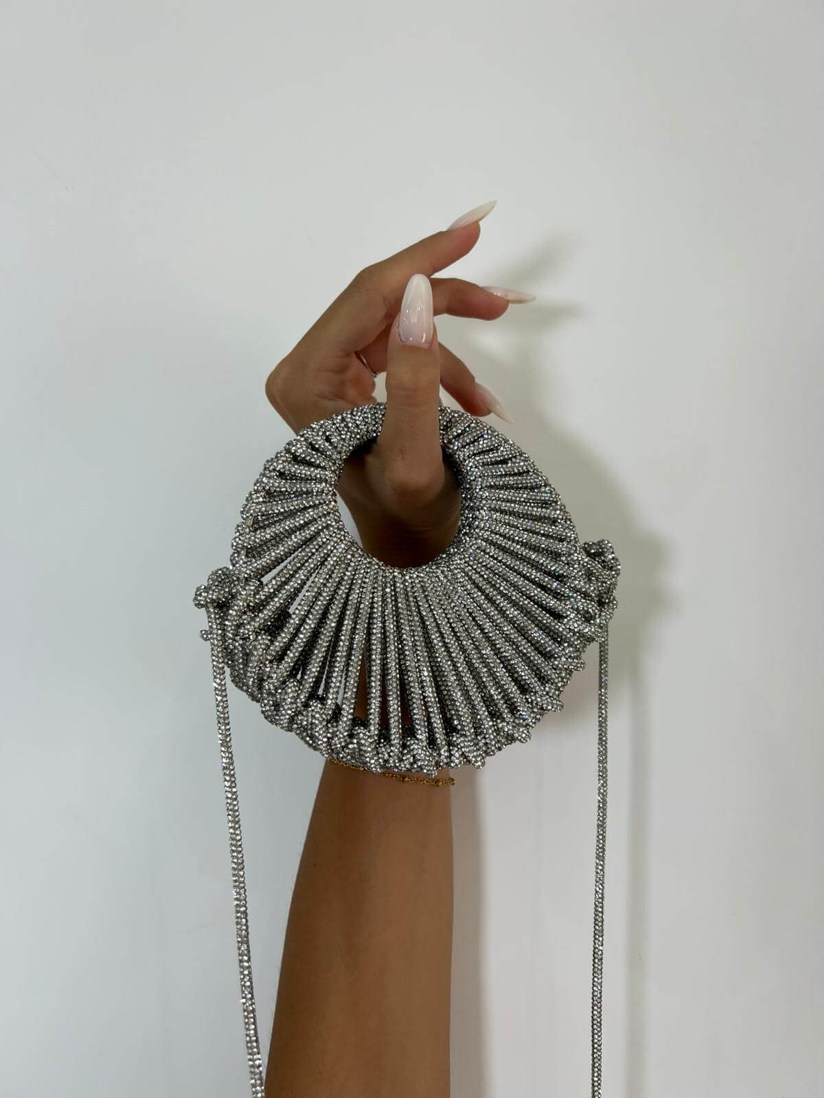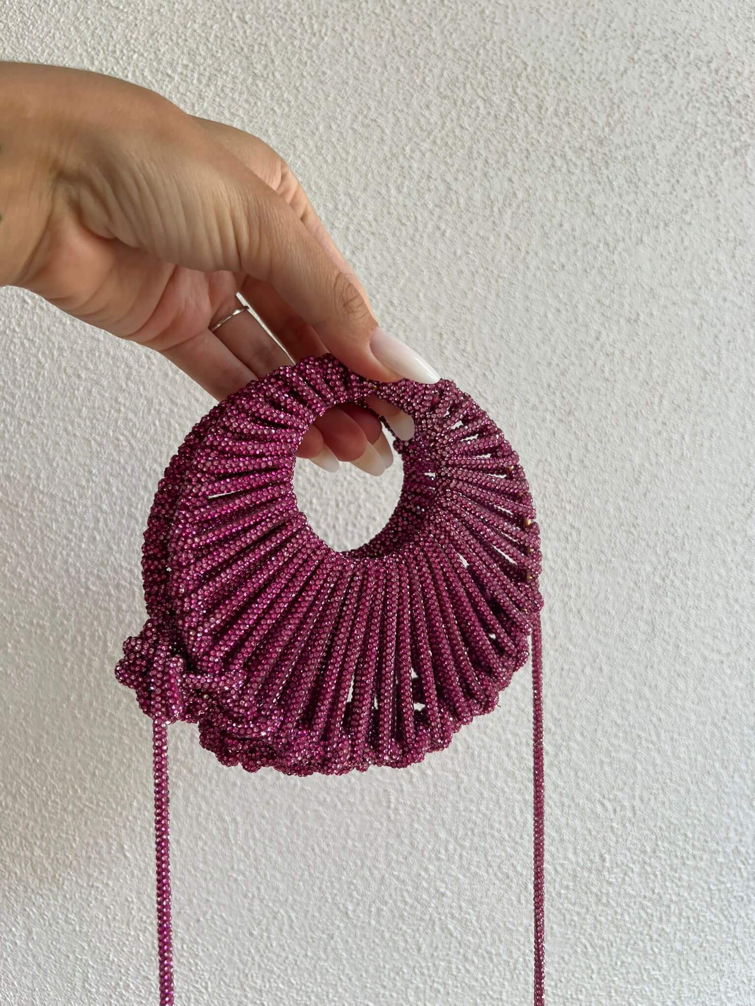Borsa realizzata a mano, con filo strass, brilla e cattura luce.