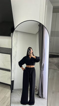 Coordinato, pantalone elasticizzato e camicia a portafoglio.