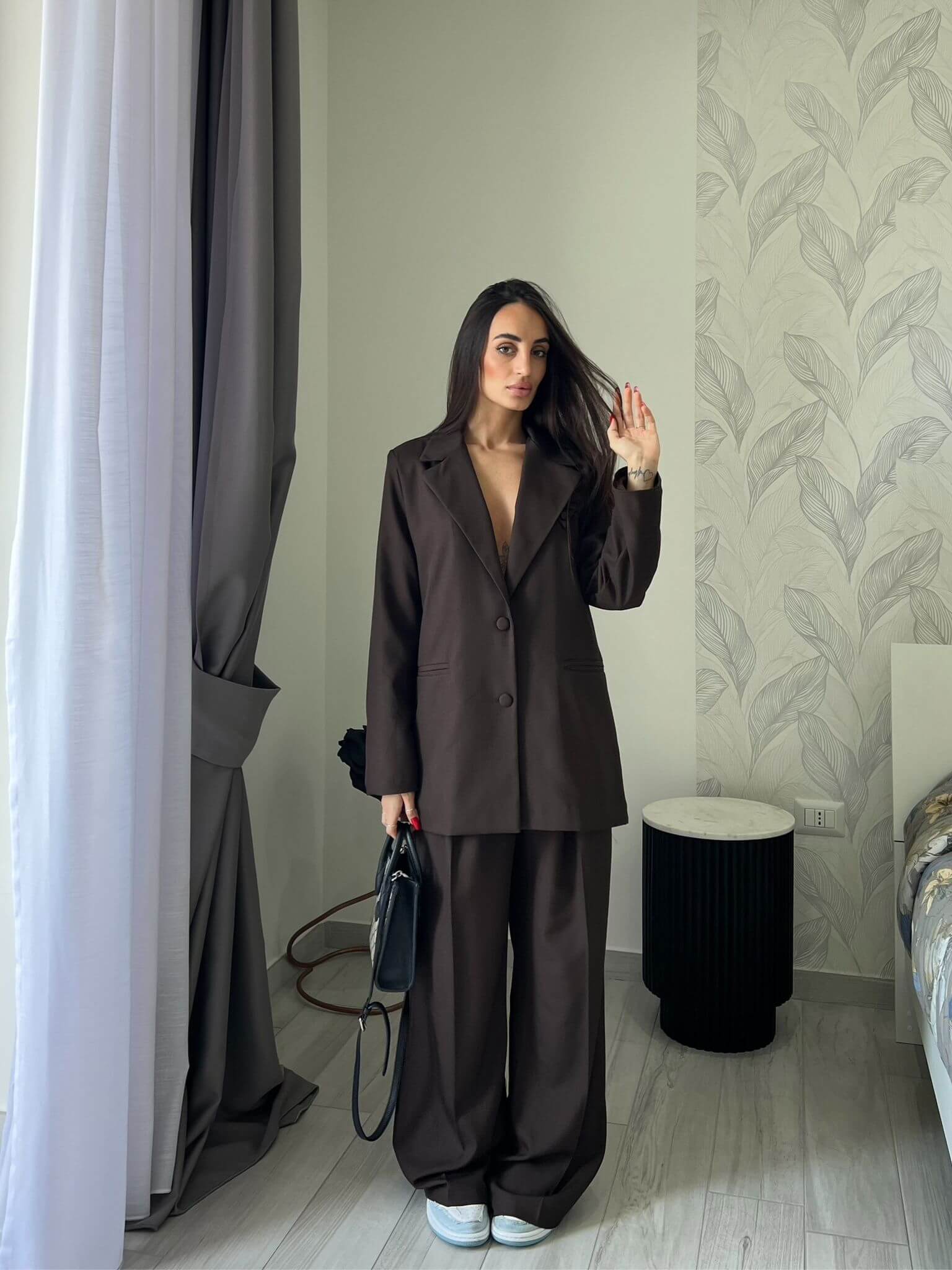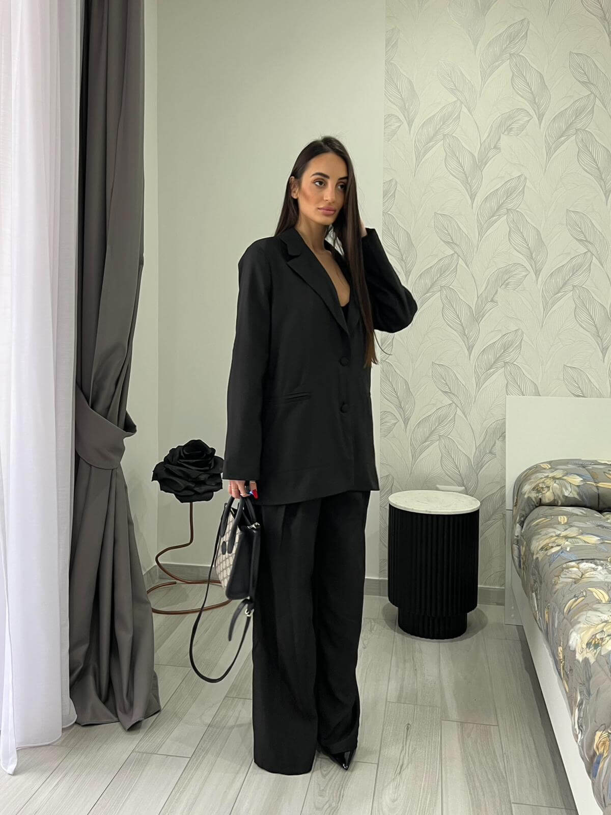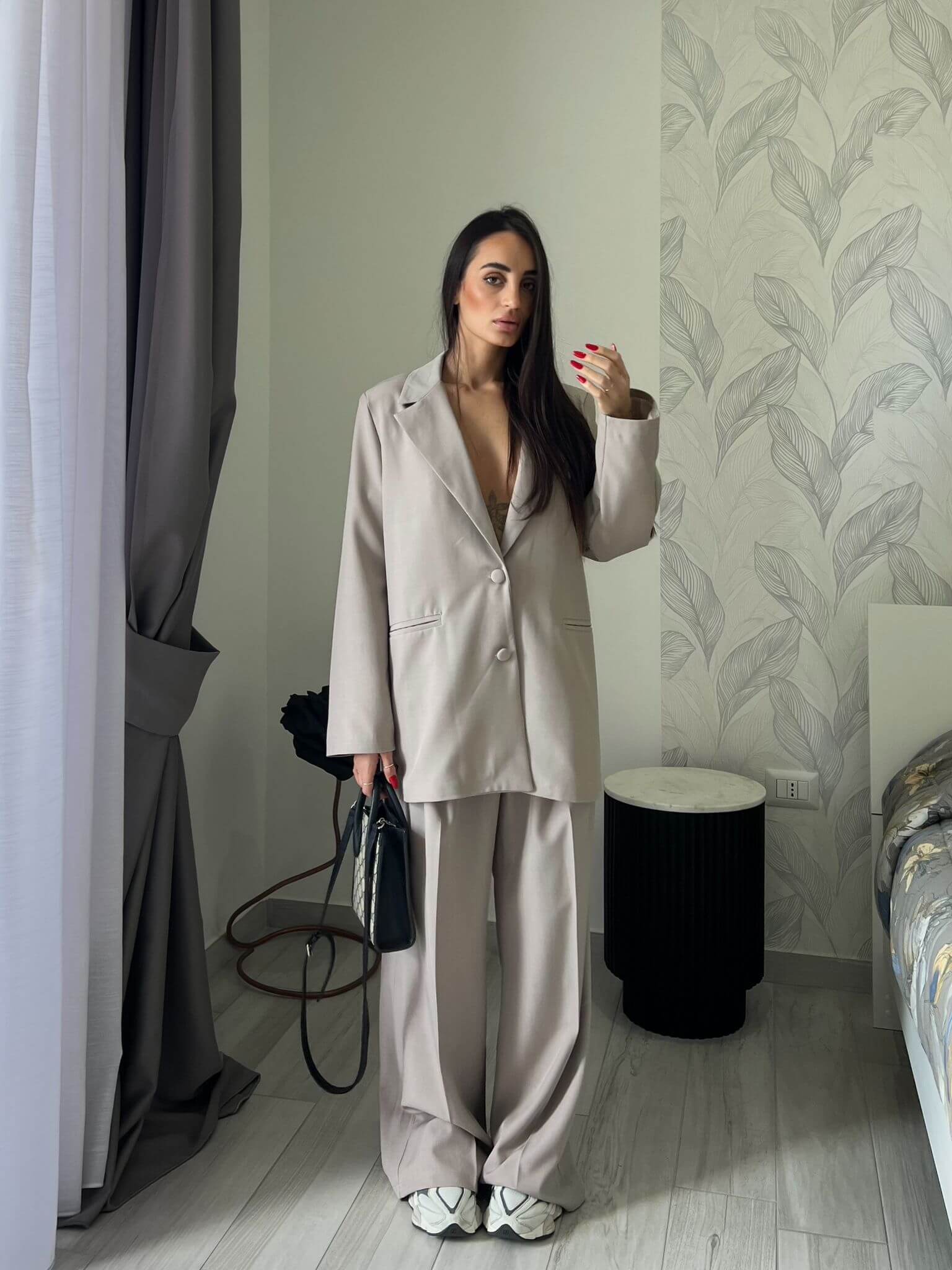 Tailleur composto da giacca over e pantalone con elastico in vita.